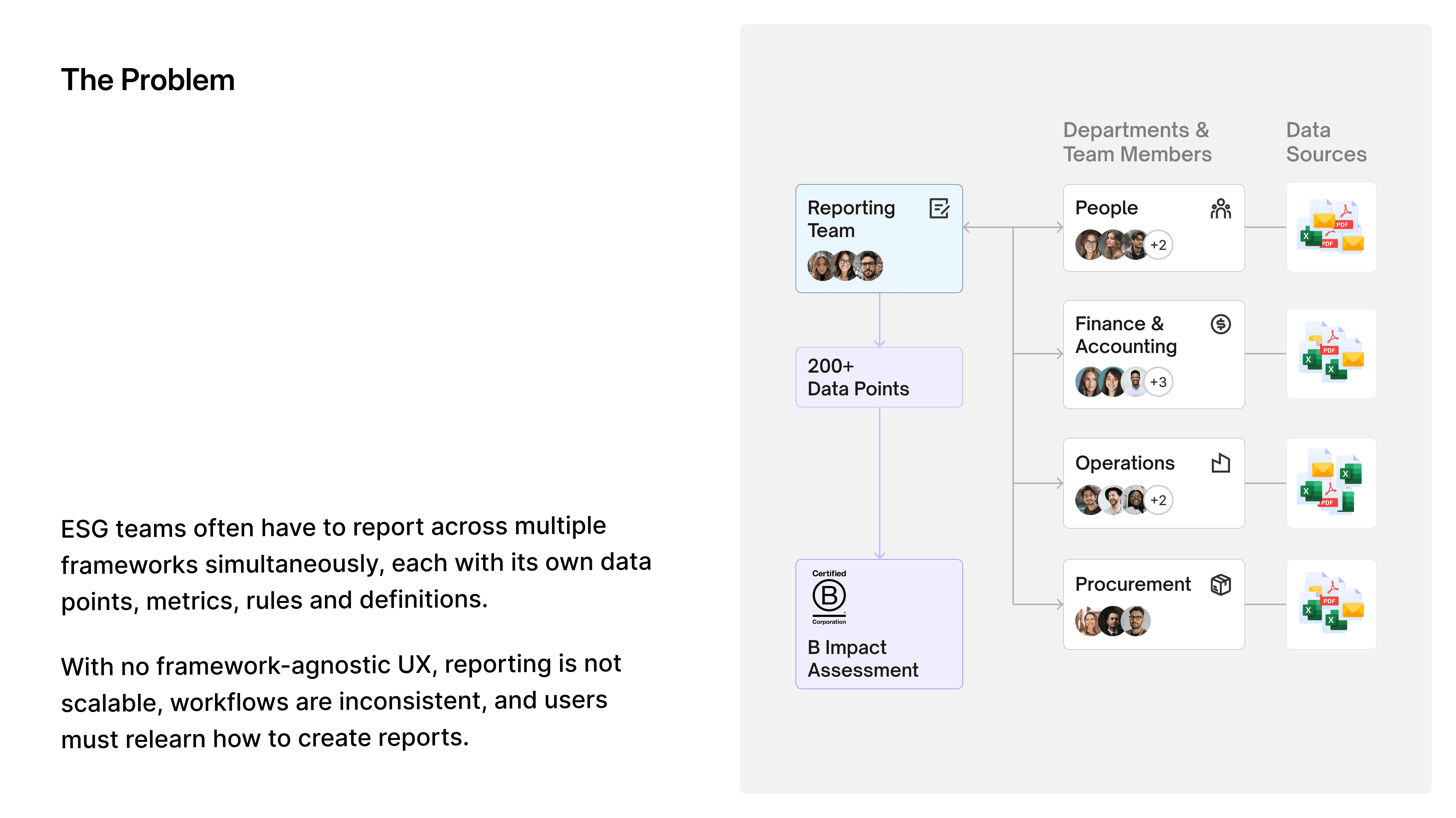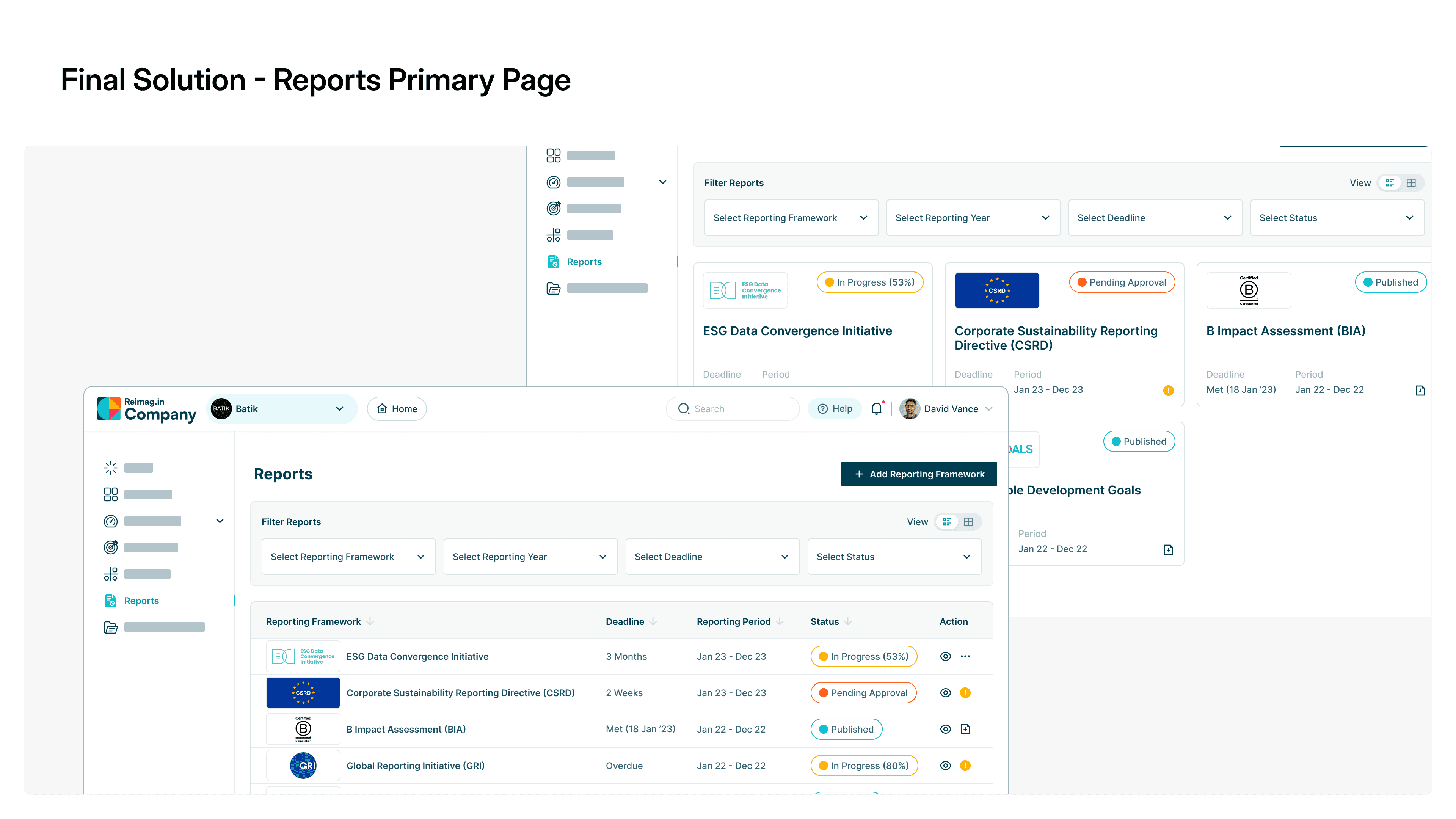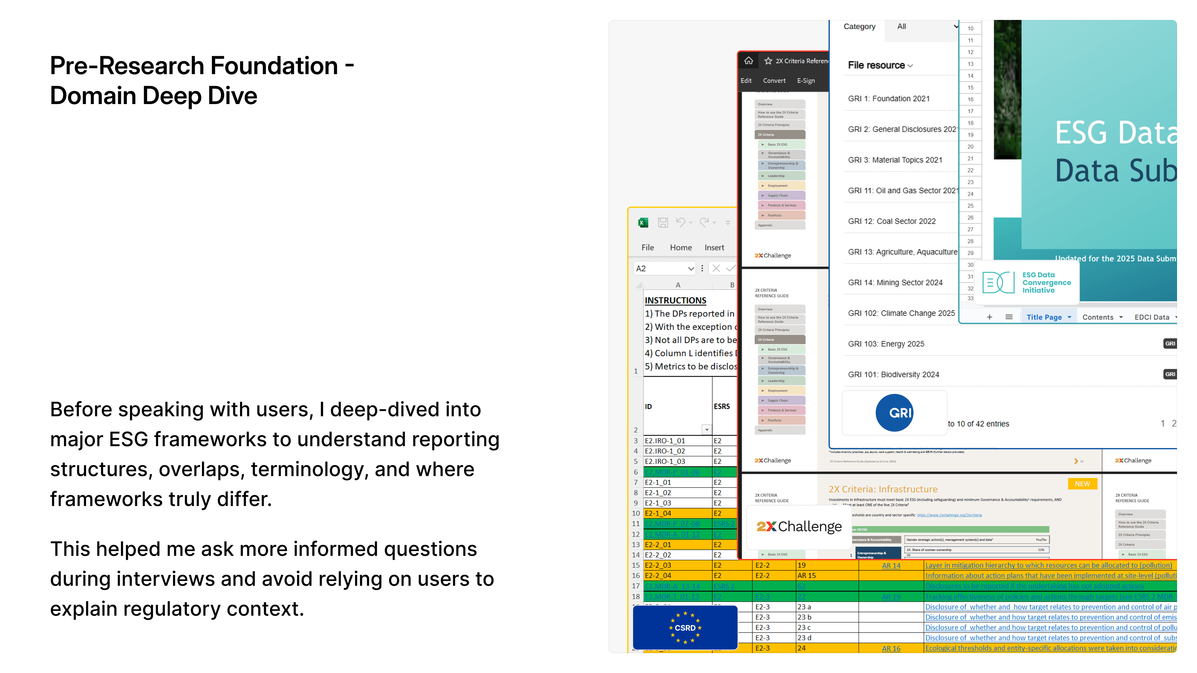 This case study is about designing a unified, scalable UX that can support over 600+ ESG reporting frameworks, each with different data models, rules, and regulatory requirements.